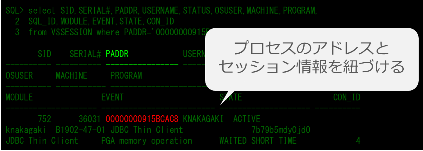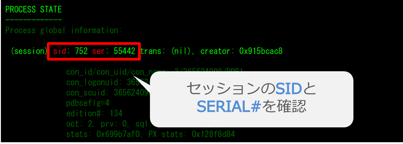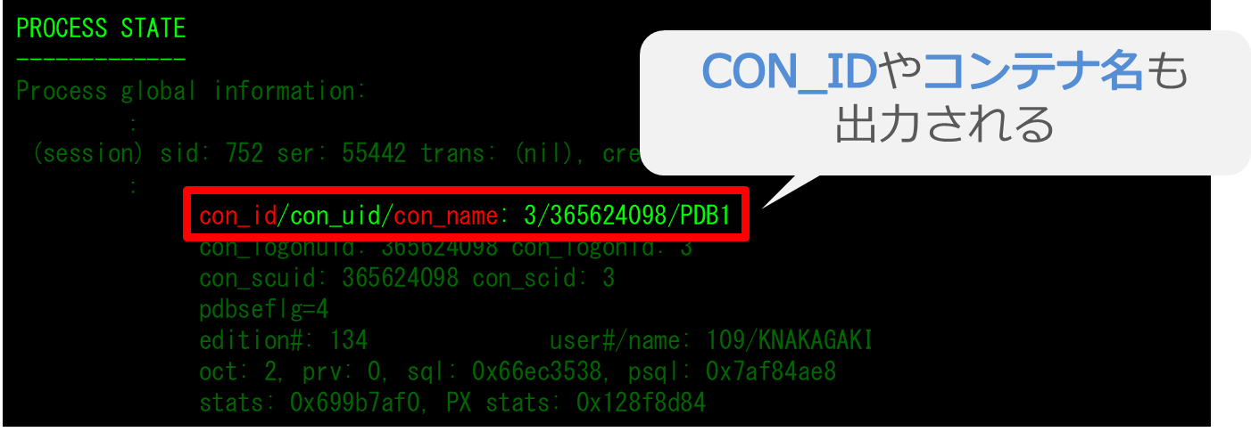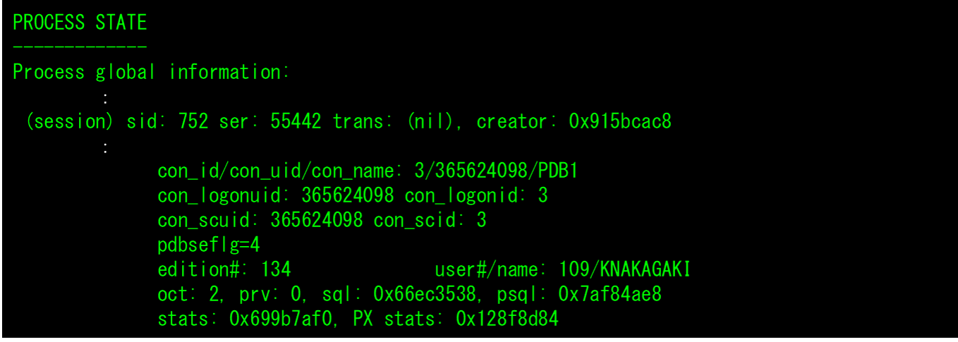 マルチテナント構成では、CON_IDやコンテナ名も確認できます。コンテナIDの出力から3番であることはわかっていましたが、このPROCESS STATEというセクションから、PDBがPDB1だというところまで確認できます。