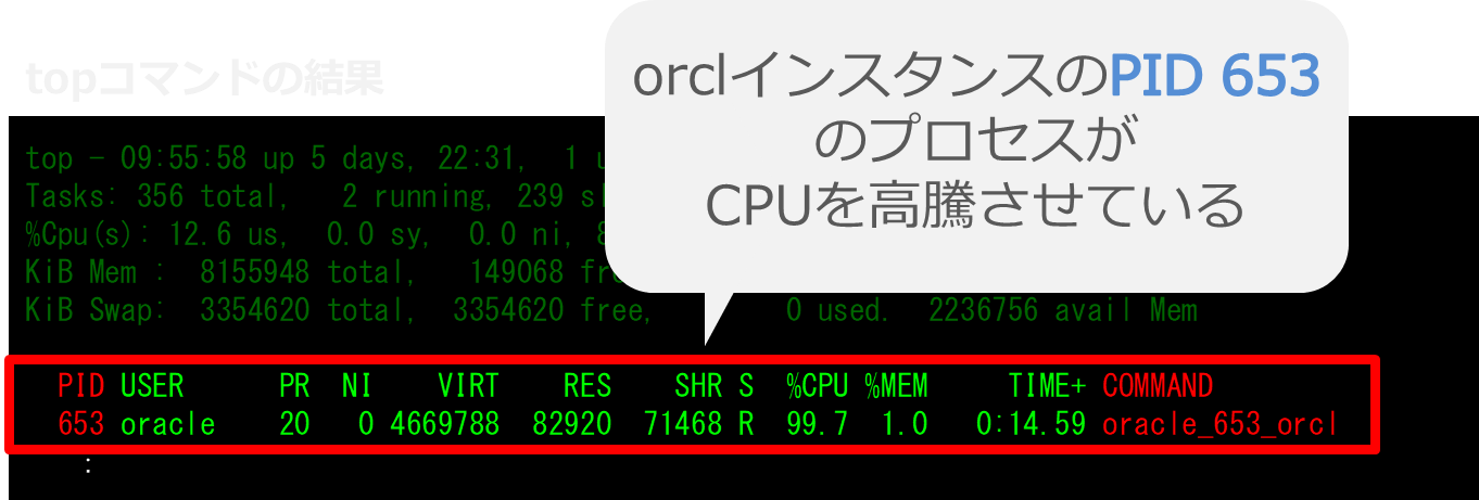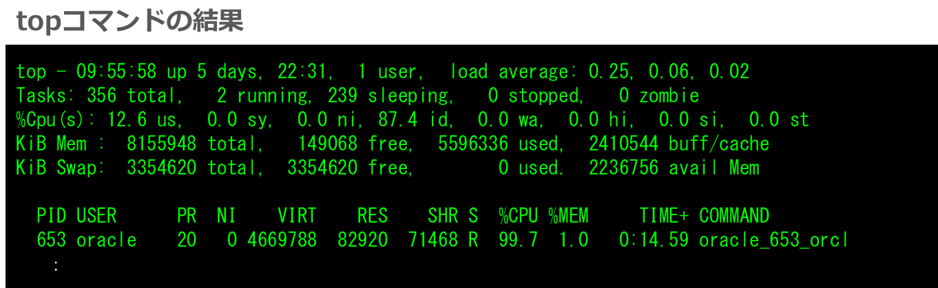 CPUを使用するプロセスがOracleプロセスかを確認するために、以下のようにtopコマンド(Linuxの場合)を実行します。
