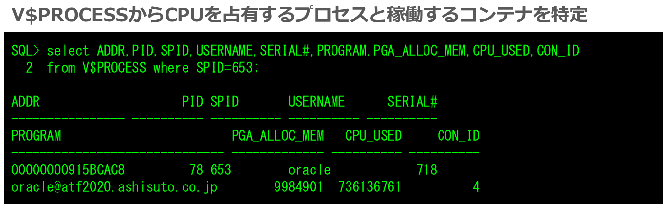 高騰を引き起こしているのがOracleのプロセスであれば、topコマンドなどからプロセスIDを確認し、V$ビューにより、CPUを高騰させているプロセスが稼働するコンテナを確認します。