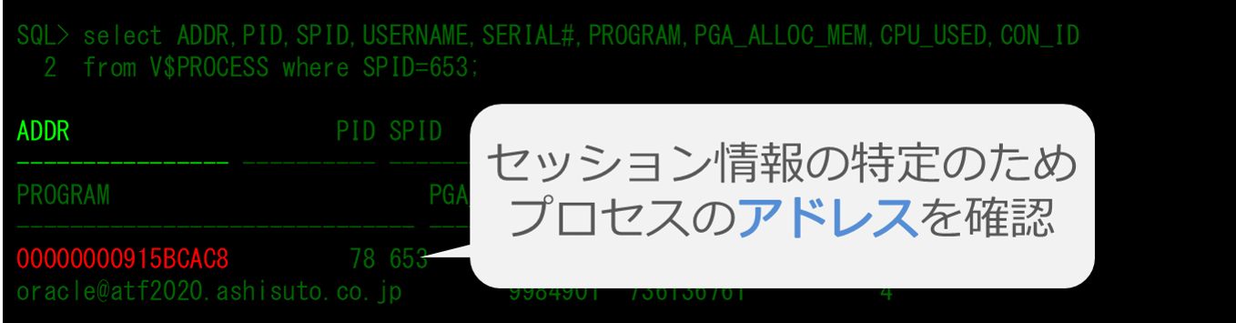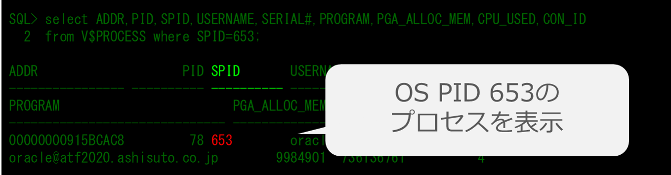 topコマンドで「PID=653のプロセスがCPUを高騰させている」ところまで確認できていたため、CDBへ接続し、V$PROCESSビューで表示された画面上で「CON_ID」列を確認すると、どのPDBで稼働しているプロセスなのかを確認できます。