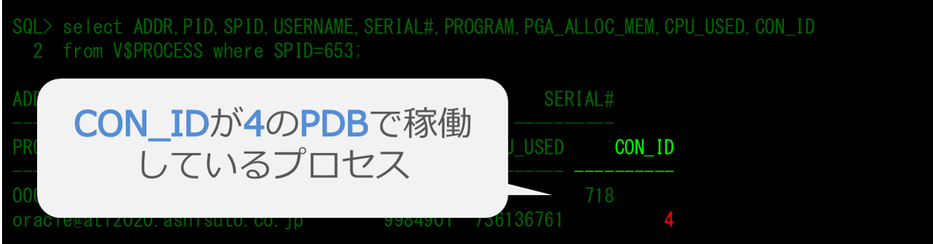 そのプロセスのCON_IDが4だということがわかります。つまり、CON_IDが4番のPDBで稼働しているプロセスであることが特定できます。