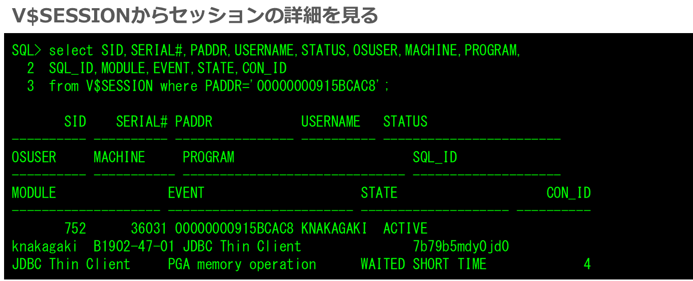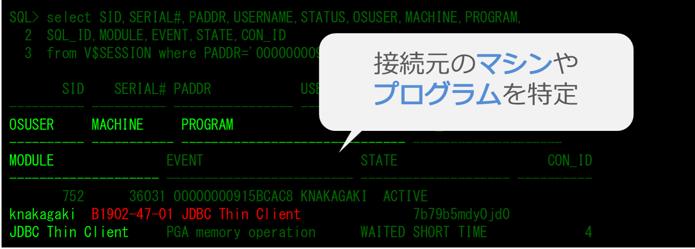 次に、V$SESSIONを使用してセッション情報を参照し、どの端末からどのSQLが実行されているのか、などを確認します。