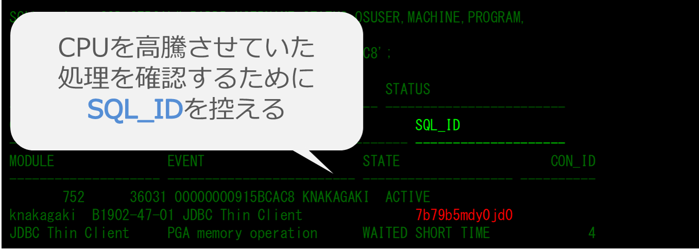 CPUを高騰させている具体的なSQL文を確認するには、このV$SESSIONビューのSQL_ID列を控えておきます。