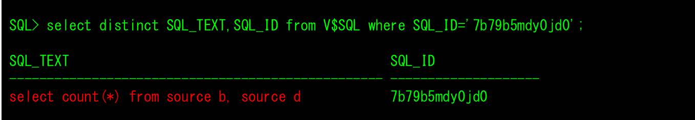 SQL文を確認する場合は、V$SQLビューからSQL_ID列を参照します。今回、CPU使用率を高騰させていたSQLは「select count(*) from source b. souce d」であることが特定できます。