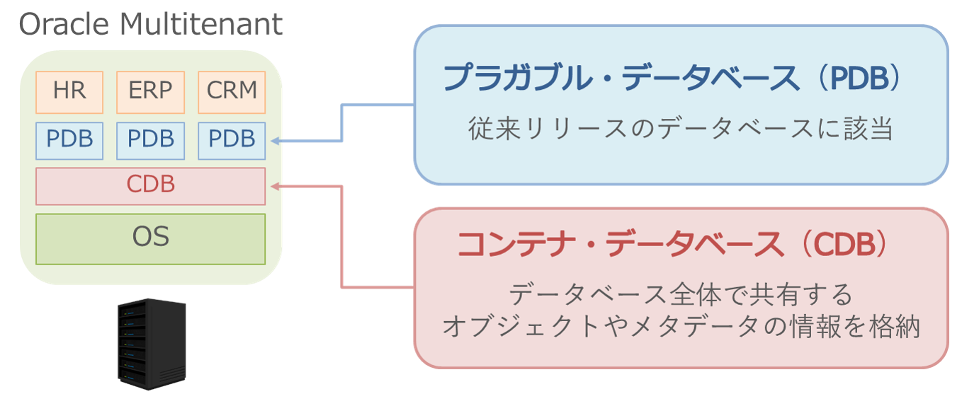 Oracle Database 12cからは、DBの中に仮想的なDBを複数作成できるマルチテナントというユニークなアーキテクチャが登場しました。マルチテナントはコンテナ・データベース(CDB)とプラガブル・データベース(PDB)の2つから構成されます。従来構成(非CDB構成)のDBに該当するのがPDBで、複数のPDBの器であり、かつDB全体で共有するオブジェクトやメタデータ情報を格納しているのがCDBになります。