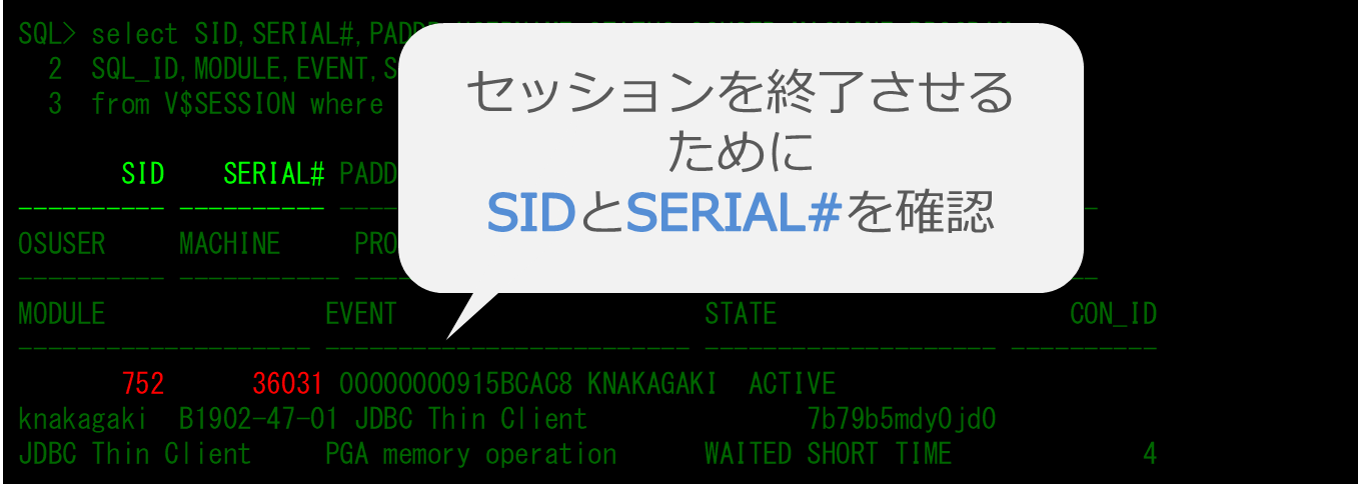 このCPU高騰を沈静化するためにセッションを強制終了します。セッションの終了には、セッションのSIDとSERIAL#が必要です。