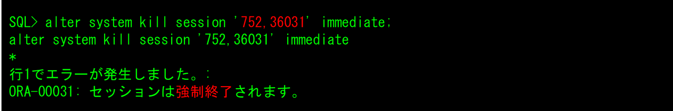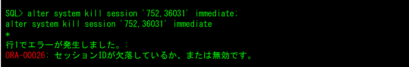 alter system kill sessionをマルチテナント構成で実行する際の注意点があります。ここまでの例ではCDBに接続してビューを参照してきましたが、このalter system kill sessionコマンドは、CDBまたはプロセスが稼働するPDB、今回であればCON_ID=4のPDBに接続することで実行できます。ここでCON_IDが3であったり5であったりと接続先のPDBを誤ると、下の例のようにコマンドが失敗に終わるため、トラブル時は基本的にCDBでの操作を推奨します。