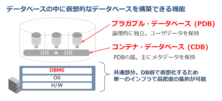 このPDBは、アプリケーションから見ると従来のデータベースとまったく変わらないため、PDBを利用するにあたりアプリケーションに何かしら変更を加える必要はありません。また、複数のPDBでハードウェア(H/W)、OS、DBMSを共有し、単一のインフラ上で多くのDBを稼働させることが可能となるため、リソースの無駄が排除されるという大きな利点があります。