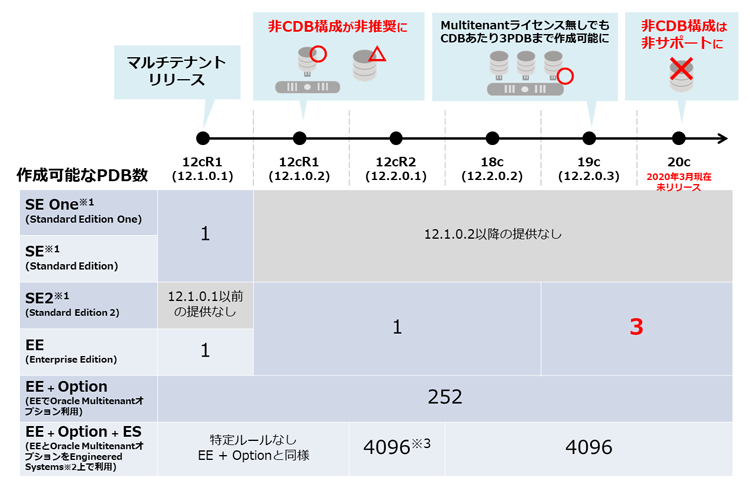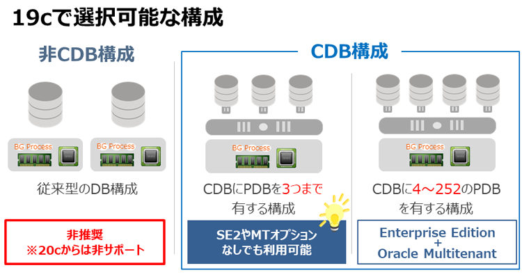 最終リリースは製品の安定性からも多く採用される傾向にあるため、特別な制約がない限りは19cを選択する企業が多いのではないでしょうか。その19cから、マルチテナントオプションを利用していなくてもCDB当たりのPDB作成可能数が1つから3つに拡張されました。これはEnterprise Editionだけではなく、Standard Edition2にも適用されます。
