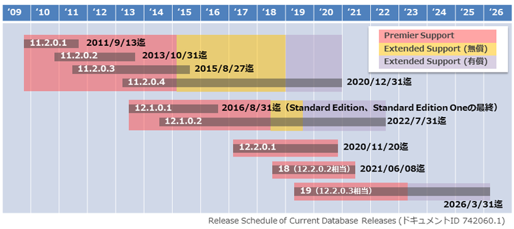 従来不定期にリリースされていたOracle Databaseは2018年から年次リリースとなり、リリース年の下二桁が製品バージョン名として採用されています。18cは12.2.0.2、19cは12.2.0.3に相当します。また、18cからExtended Support(所定の追加料金を支払うことにより新規パッチの提供が可能な長期サポート)は特定バージョンで設定されます。