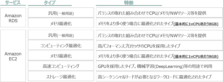 Amazon RDSでは、「汎用(一般用途)」、「メモリ最適化」の2種類、Amazon EC2では5種類のインスタンスタイプが提供されています。「メモリ最適化」に関しては、基本的に1vCPUあたり8GBのメモリが用意されています。