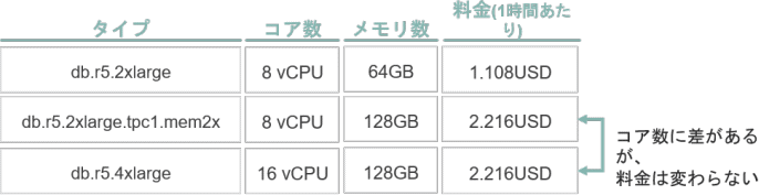 Amazon RDSで「メモリ最適化」を選択した場合は、コア数を抑えメモリだけを増強できるインスタンスタイプが用意されています。今回の要件に適合可能ですが、利用料が変わる点に注意が必要です。