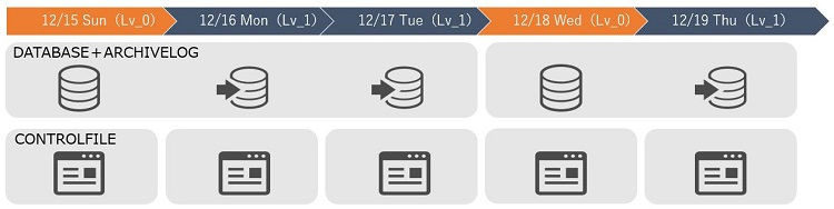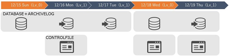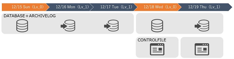 例えば、"CONTROLFILE AUTOBACKUP ON"、"RETENTION POLICY TO REDUNDANCY 2"の設定で日曜日、水曜日にベースバックアップ(BACKUP INCREMENTAL LEVEL 0 DATABASE PLUS ARCHIVELOG DELETE INPUT)、それ以外の曜日は累積増分バックアップ(BACKUP INCREMENTAL LEVEL 1 DATABASE PLUS ARCHIVELOG DELETE INPUT)を行っているような環境では、下図のようにグレーの枠が“世代“として認識されます。