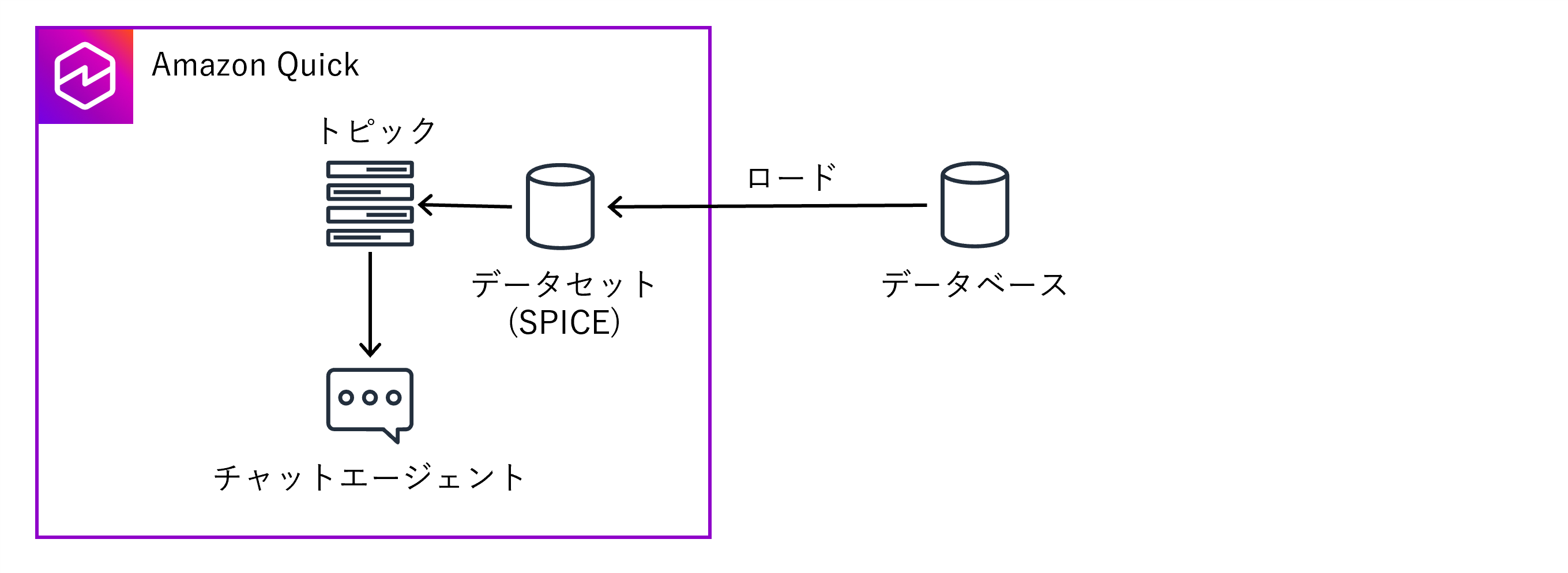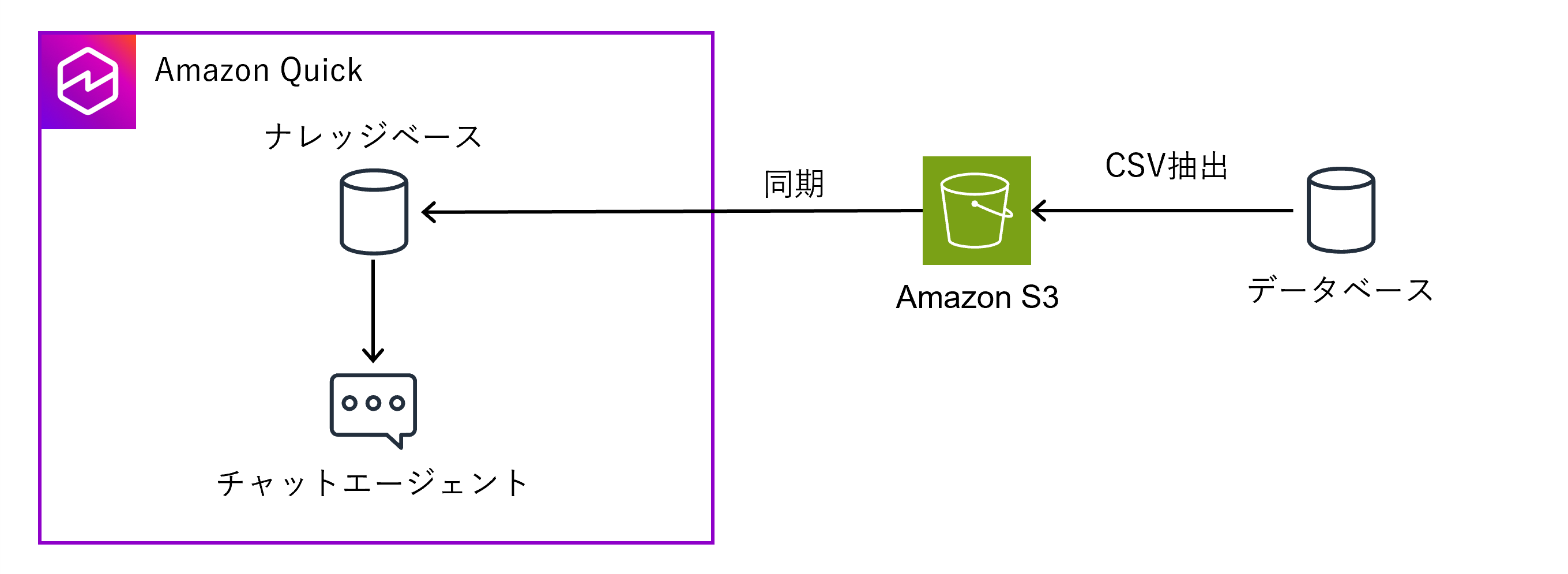 PoCでこれらを試したい場合「データベースのデータから一部をCSVで出力してS3バケットに配置し、それをAmazon Quickの検索対象(ナレッジベース)にする」という方法を取るパターンが多いかと思います。