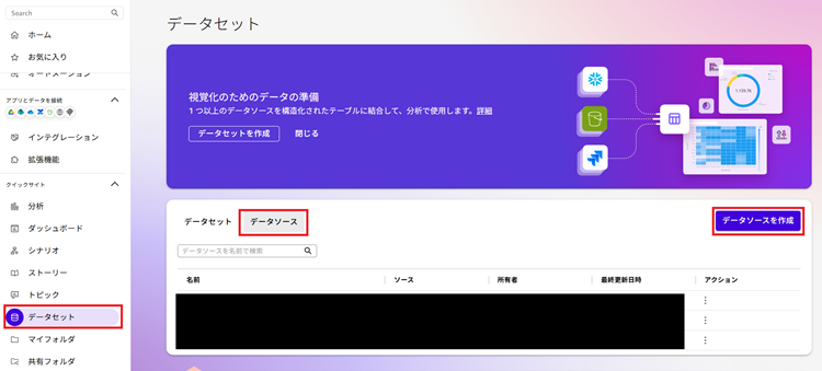 1. Amazon Quickにログインし[データセット]-[データソース]-[データソースを作成]をクリックします。