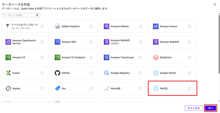 まずは「データセット」機能を利用して、Amazon QuickとMySQLを連携させます。