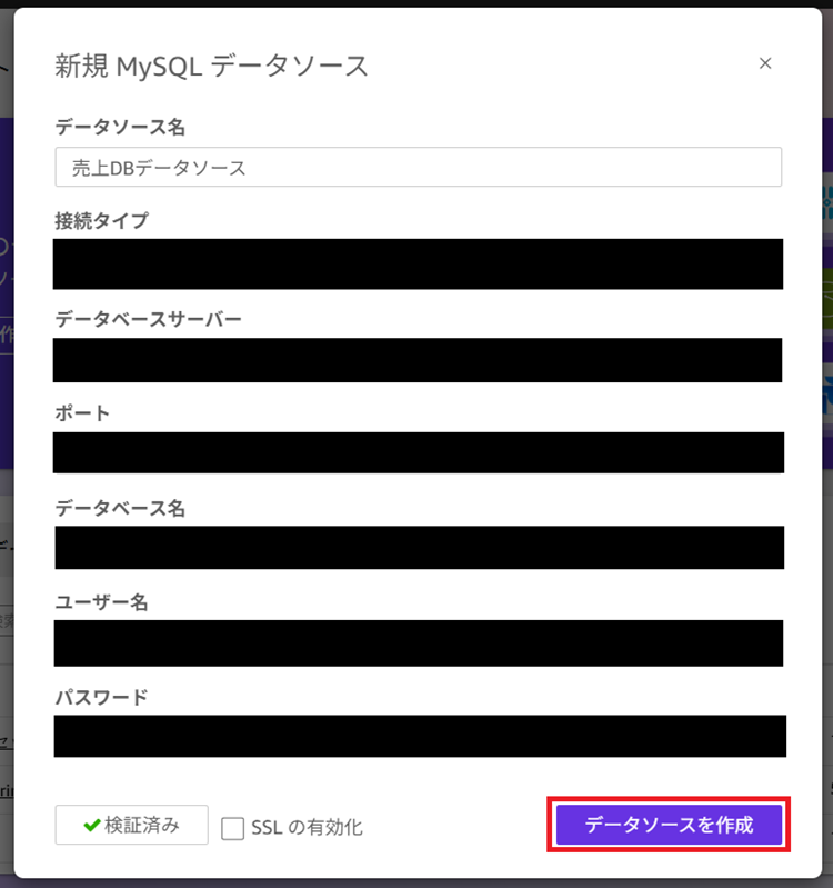 3. 接続先情報を入力し[データソースを作成]をクリックします。