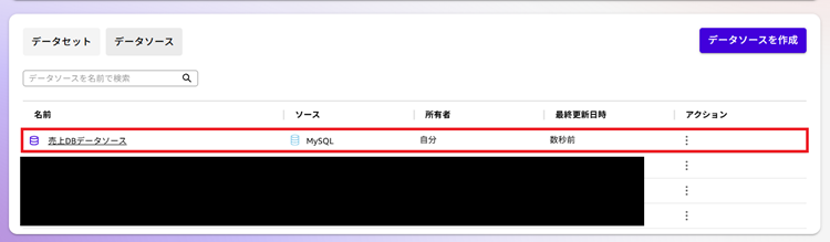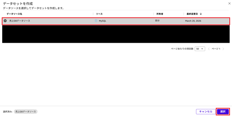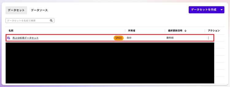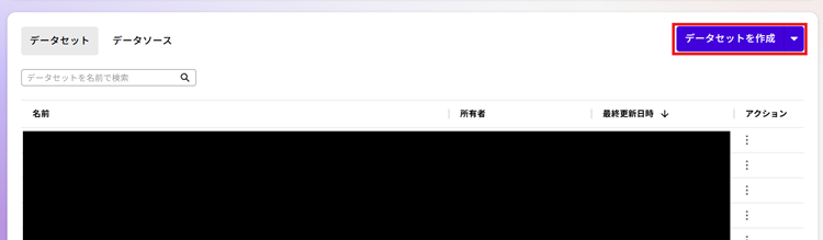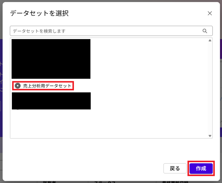 3. 先ほど作成したデータセットを選択し[作成]をクリックします。