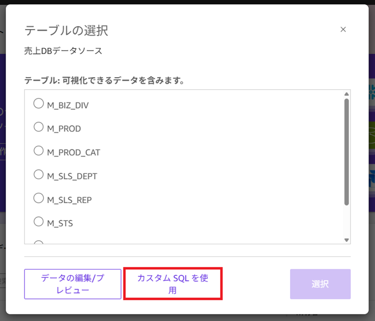 7. 利用可能なテーブル一覧が表示されます。今回はAIが利用しやすいように、トランザクションテーブルとマスタテーブルをJOINした状態のデータセットを作成したいので[カスタムSQLを使用]をクリックします。