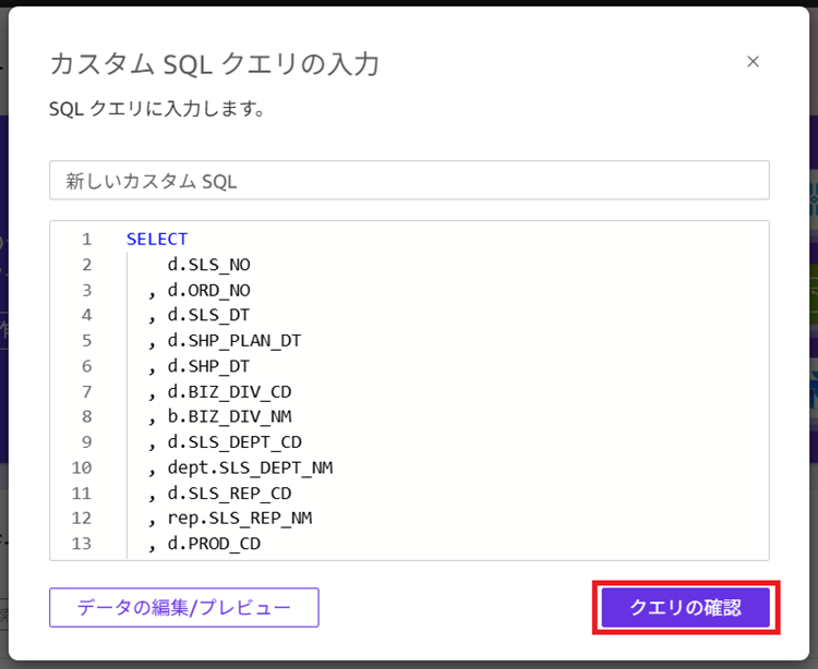 8. JOINしたい内容のSQLを記述して[クエリの確認]をクリックします。