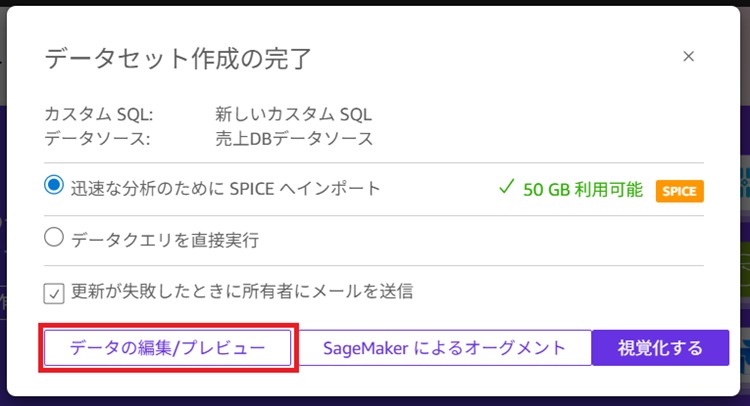 ※今回はSPICEへインポートを選択しています。SPICEはQuickのインメモリDBのような領域です。SPICEを選択することで毎回DB本体にクエリを実行する必要がなくなるため、DBへの負荷軽減やレスポンス向上が期待できます。