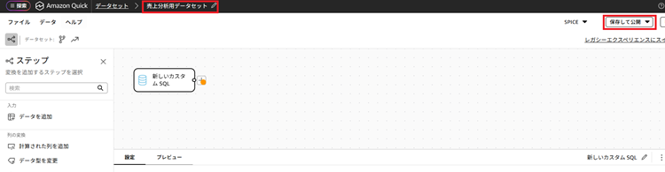 10. 画面左上の「カスタムSQL」となっている部分を任意の名前(今回は「売上分析用データセット」)に変更し、画面右上の[保存して公開]をクリックします。その後パンくずリストの「データセット」をクリックします。