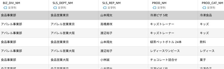 カラム名を見ていただくと「BIZ_DIV_CD」など、どういう情報が入っているか推測しづらい名前になっています。(実際には「事業部コード」を意味しています)