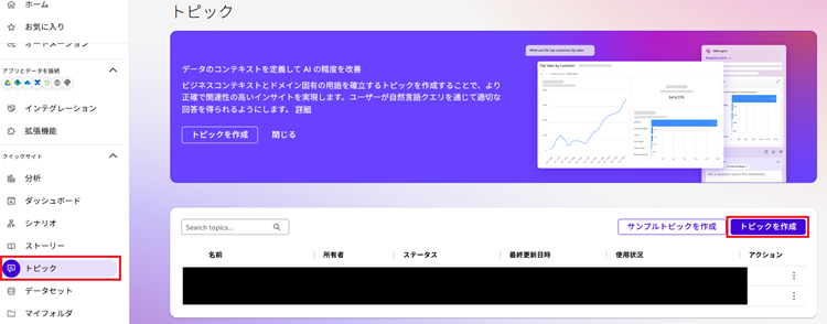 現状のデータセットはJOINされているので「BIZ_DIV_CD」といったコードではなく「BIZ_DIV_NM」のように実際の部門の情報が入っています。しかし、実際にユーザーがAIに質問する際は「BIZ_DIV_NM毎の売上合計金額を教えて」ではなく「事業部毎の売上合計金額を教えて」といった内容になるかと思います。最近のAIの性能であれば、データの中身を見て「この列は事業部列だな」と判断してくれる可能性はありますが、より精度を上げるためにはAIが理解しやすい情報に変換したり、追加の情報=コンテキストを与えることが重要です。「トピック」機能を利用するとこれらの設定を実施することができます。