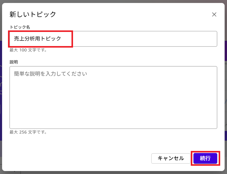 2. 任意のトピック名(今回は「売上分析用トピック」)を入力し[続行]をクリックします。