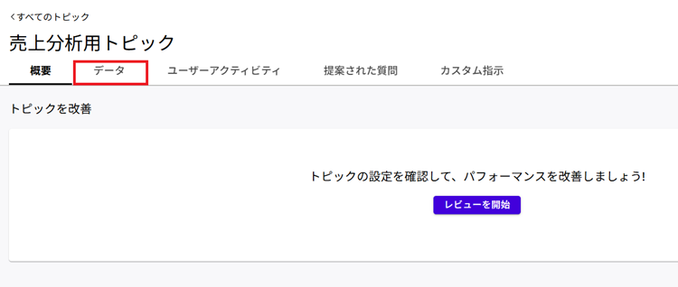 4. しばらくするとトピックの作成が完了します。続いて[データ]をクリックします。