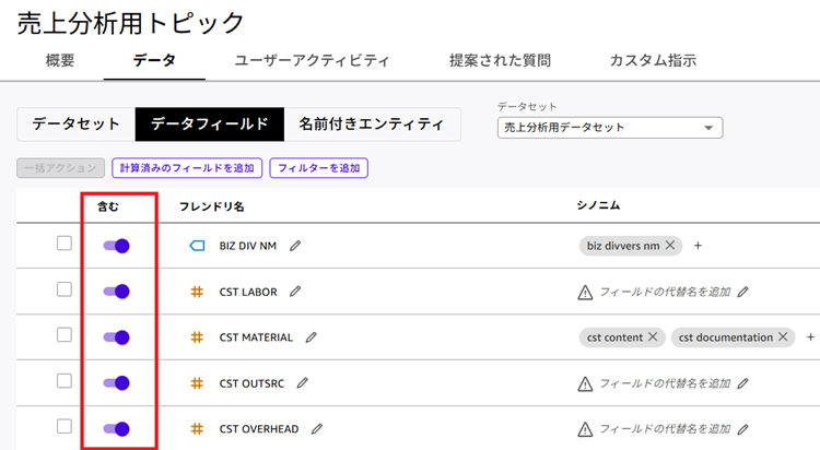 5. この画面でAIが理解しやすいデータにコンテキストを与えていきます。まず「含む」を設定します。「含む」でAIの検索対象に含めるか否かを選択します。管理コードなど分析に利用しないことが予想されるデータは対象から除外することでノイズを除去できます。今回は全ての列を検索対象にしたいので「含む」に加えておきます。
