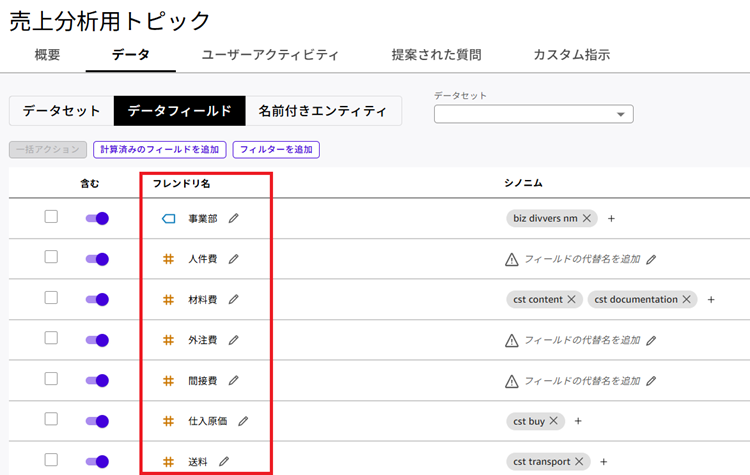 ※ここでは手順は省きますが、私はKiro CLIを使って「データの内容を見てわかりやすいフレンドリ名をつけて」とお願いしました。列名が多いときに手動で変更するのは大変なのでAIに頼ると楽です。