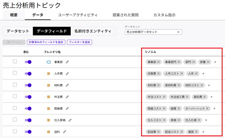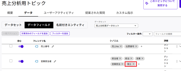 7. 続いて「シノニム」を設定します。シノニムは「別名」です。例えば「営業担当」と言う列があったとして、自社では「MD(マーチャンダイザー)」と呼ぶ人もいるような場合は、営業担当列のシノニムに「MD」と設定します。こうすることで「売上トップ10のMDを教えて」と質問した際にAIは「売上トップ10の営業を答えればいいんだな」と解釈できます。