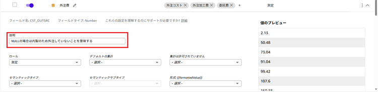 8. 最後に「説明」を追加します。説明を追加したい列をクリックすることで入力欄が表示されます。例えば「外注費」列に「NULLの場合は内製のため外注していないことを意味する」といった内容を入力します。このようにAIがテーブルの情報を見ただけではわからない補足情報を記載することで精度向上が期待できます。