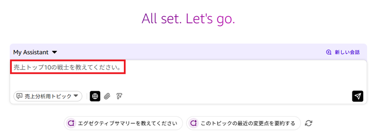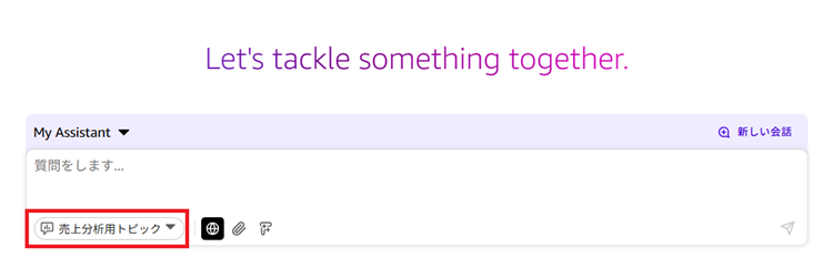 チャットエージェントを開きます。「売上分析用トピック」が選択されていることを確認します。