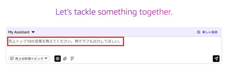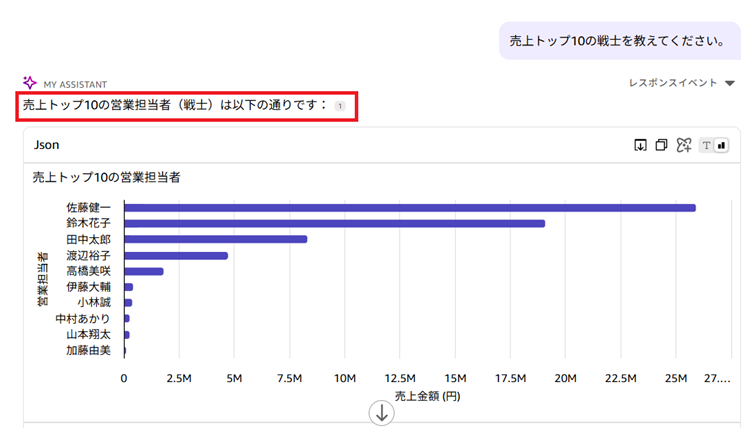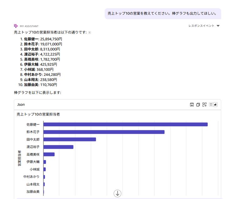 「売上トップ10の営業を教えてください。棒グラフも出力してほしい。」と聞いてみます。
