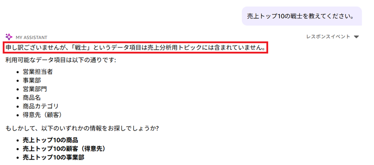 次にシノニムの効果を確認してみましょう。例えばこの企業では営業のことを「戦士」と呼ぶ人もいると仮定します。そこで「売上トップ10の戦士を教えてください。」と聞いてみます。