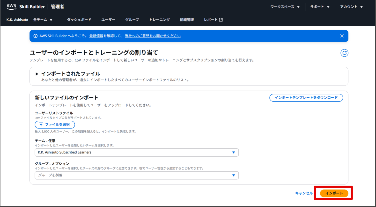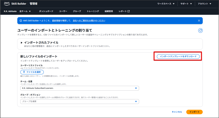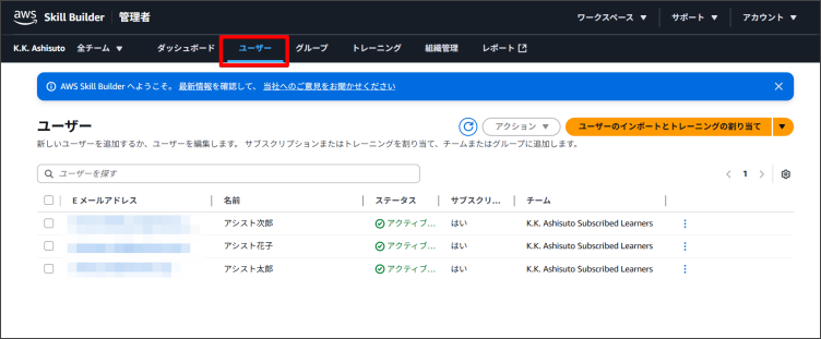 2.「ユーザー管理」画面から「ユーザーのインポートとトレーニングの割り当て」をクリックします。