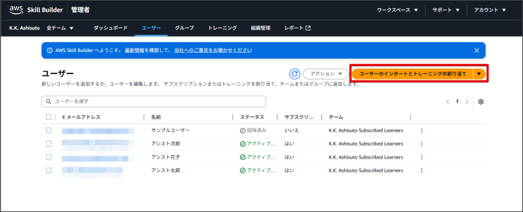 2.「ユーザー管理」画面から「ユーザーのインポートとトレーニングの割り当て」 横の