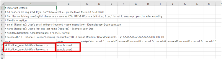 ※CSVファイル内に日本語で名前を記載するとエラーが発生するため