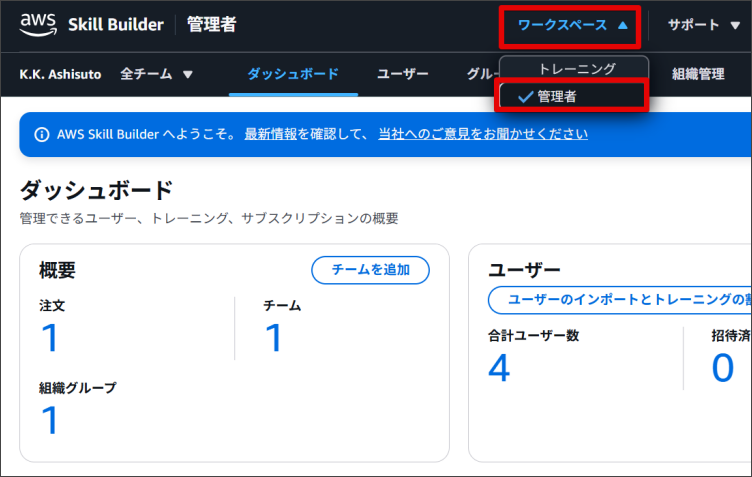 AWS Skill Builderのダッシュボード画面の右上の「ワークスペース」タブより「管理者」を選択します。