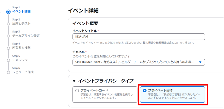 1.イベント作成時にイベント概要の「イベントプライバシータイプ」より「プライベート招待」を選択します。