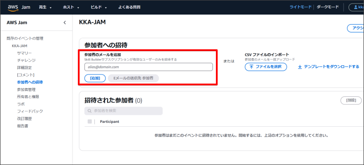 2.イベント作成後、左メニューより「参加者の招待」を開き、招待する参加者のメールアドレスを入力します。