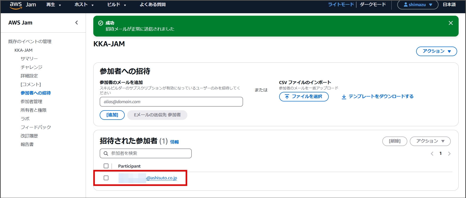 5.「成功」バナーが表示されていることと、招待された参加者タブにメールアドレスが
