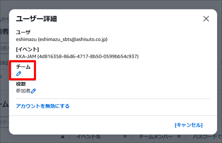2.ユーザー詳細画面に遷移します。「チーム」項目の鉛筆マークをクリックします。