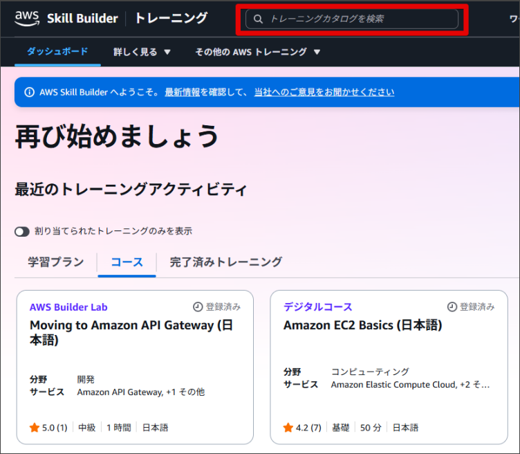 2.ダッシュボード内の検索窓、もしくは「詳しく見る」ボタンから登録したいトレーニングを探します。