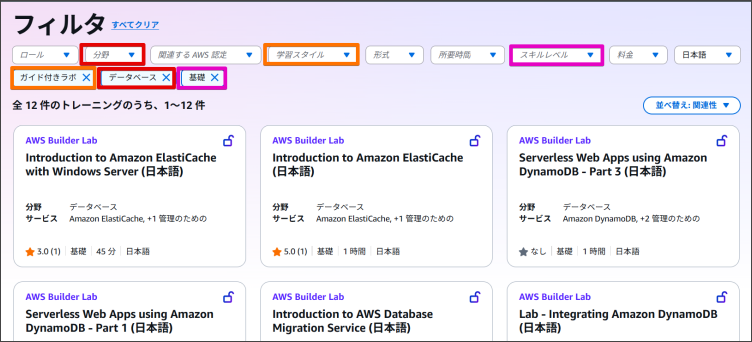→「分野 > データベース」、「学習スタイル > ガイド付きラボ」、「スキルレベル > 基礎」を