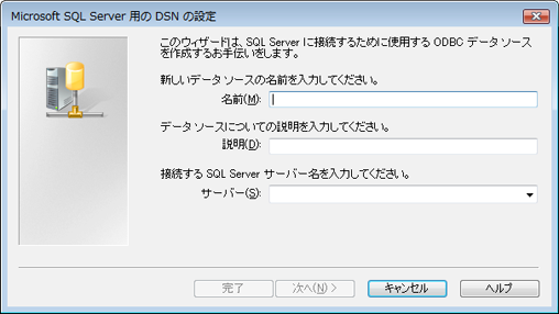 (1)「名前」に任意のデータソース名を入力、「サーバ」に接続するホスト名を選択し、「次へ」をクリックします。 |