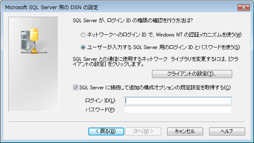 (2)Windows認証を行う場合は、「ネットワークへのログインIDで、WindowsNTの認証メカニズムを使う」を選択し、SQLServerによる認証の際は「ユーザーが入力するSQLServer用のログインIDとパスワードを使う」を選択します。必要に応じてログイン名、パスワードを記入し「次へ」を選択します。 |