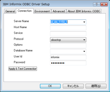 (2)Connectionタブを選択し、「Server Name」に接続するInformixサーバ名、「Host Name」に接続するホスト名、Serviceにポート番号、「Protocol」にプロトコル、「Database Name」に接続するデータベース名、「User Id」にユーザ名、「Password」にパスワードを入力します。 |